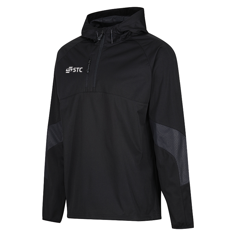 – Hooded technical ¼ zip pullover top with zipped chest pocket